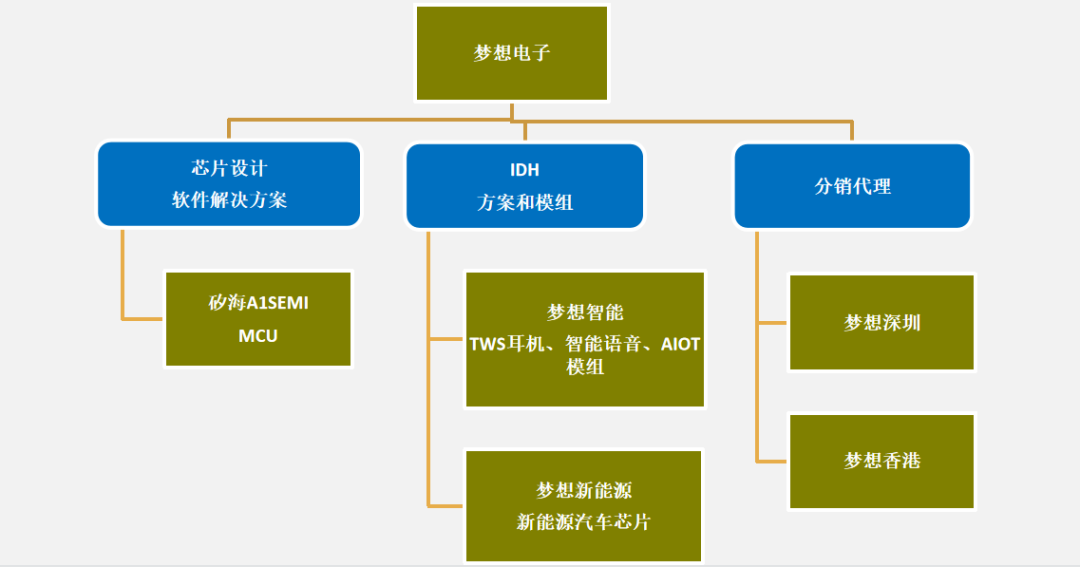 4個(gè)業(yè)務(wù)板塊:矽海半導(dǎo)體(A1semi)為芯片設(shè)計(jì)、應(yīng)用方案及模組提供商;夢想智能為TWS耳機(jī)、智能語音、IOT模組成套解決方案提供商;夢想新能源為新能源汽車和儲能的方案芯片提供商;夢想電子為元器件授權(quán)供應(yīng)商。